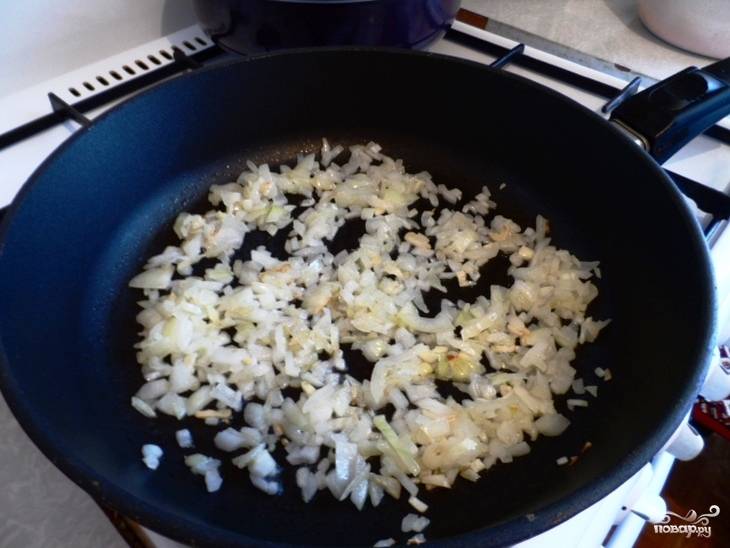 Разогрейте сковороду и вылейте на нее растительное масло. Прекрасно подойдет оливковое. Лук очистите и нарежьте полукольцами. Паассируйте его с измельченным чесноком до мягкости.
