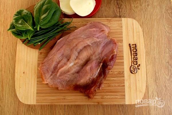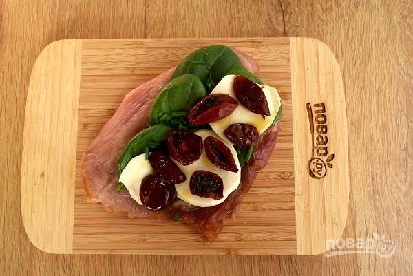 Положите на половину мяса шпинат, измельченный лук, моцареллу и вяленые томаты.