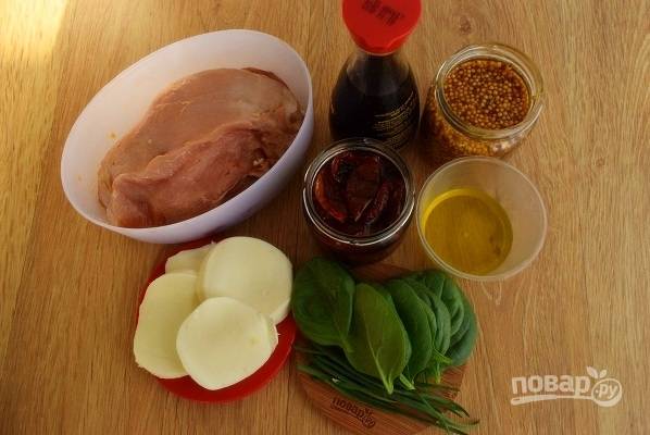 Подготовьте необходимые продукты. Филе заранее замаринуйте в соевом соусе минимум на 2 часа. Моцареллу нарежьте на тонкие ломтики.