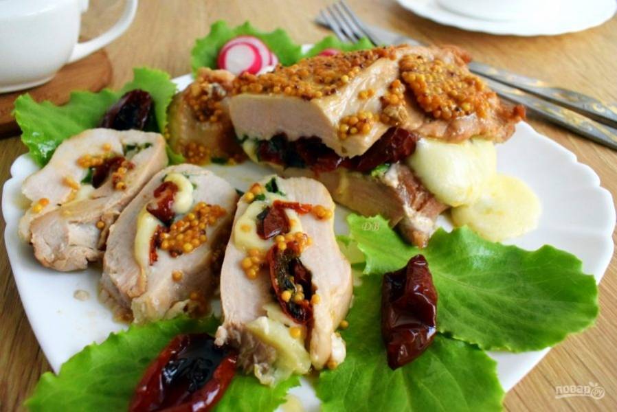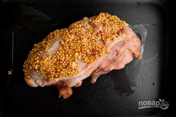 Закройте начинку второй половиной мяса, закрепите края зубочистками. Сверху выложите французскую горчицу. Противень смажьте оливковым маслом. Запекайте мясо в разогретой до 180 °C духовке в течение 30 минут.