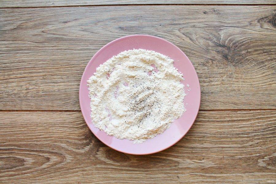 Яйца разбейте в миску, посолите и перемешайте вилкой до однородности. Полностью покройте яйцом куски рыбы в муке.
