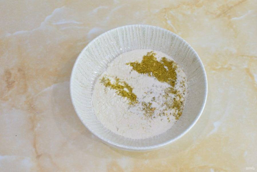 В отдельной миске смешайте муку, соль, молотый перец и специи для рыбы.