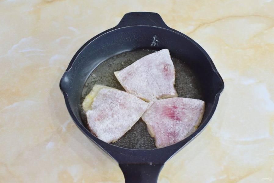 В горячую сковороду налейте растительное масло. Каждый кусочек рыбы обваляйте в мучной смеси и выложите в сковороду.