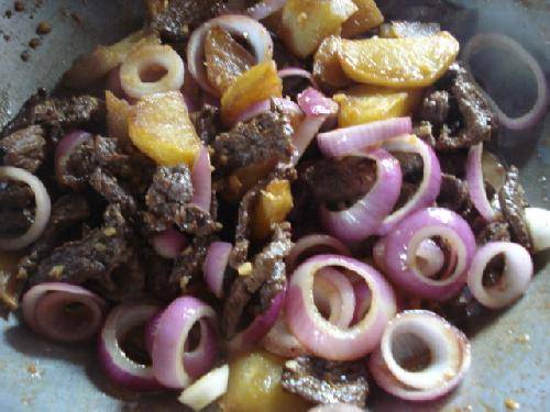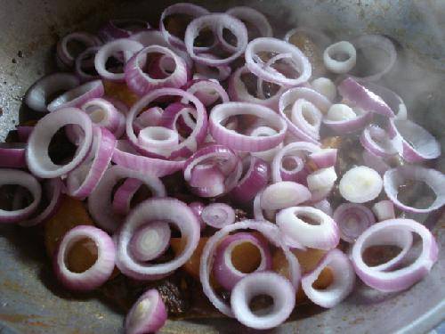 Налейте немного маринада и немного воды в говядину. Варить до готовности. Далее добавляем картофель и нарезанный кольцами лук.