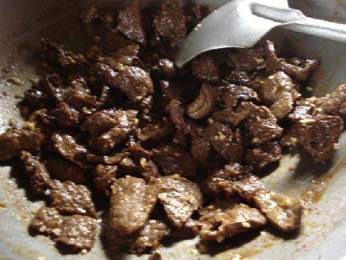 В ту же сковороду кладем чеснок и говядину. Обжариваем до коричневого цвета.
