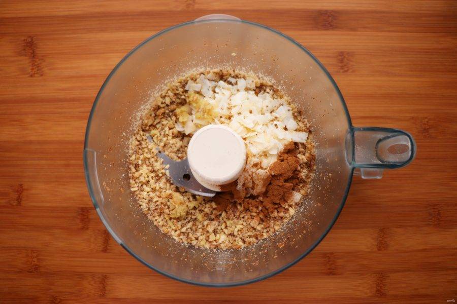 Затем добавьте к орехам кокос, корицу, натертый имбирь и зернышки кардамона.