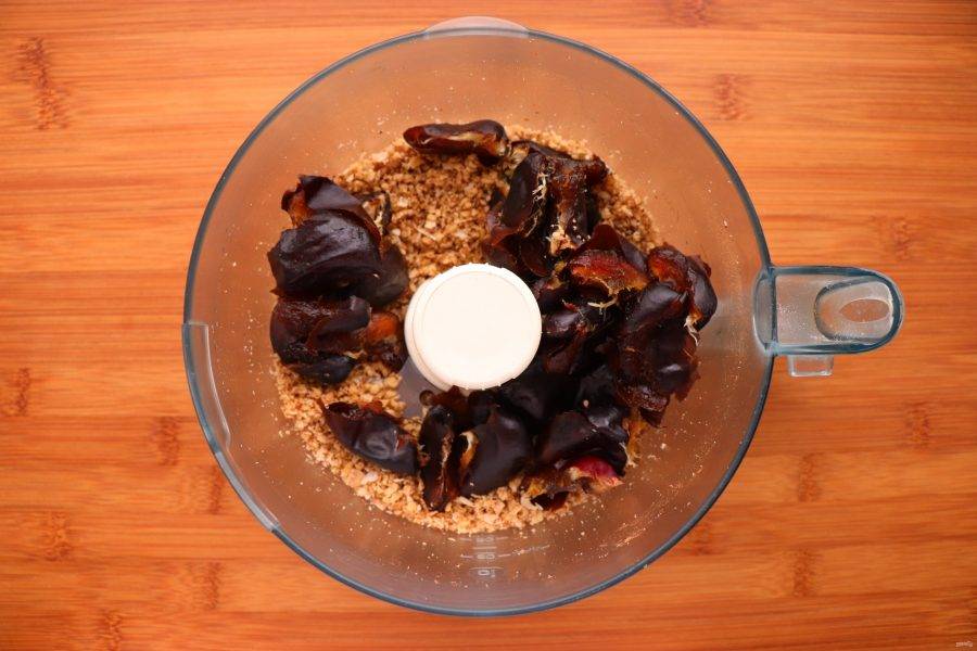 В последнюю очередь добавьте финики. Измельчите до нужной вам консистенции. Масса должна получиться плотной и не сильно липкой. Если она слишком липкая, добавьте больше кокоса или грецких орехов.