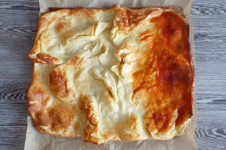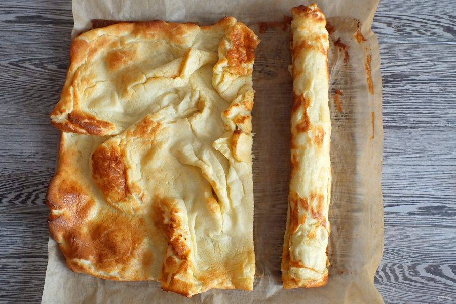 Во время выпечки блин будет вздуваться, образовывать бугорки, но как только вы его достанете из духовки, все неровности осядут. По истечении времени достаньте блин из духовки.