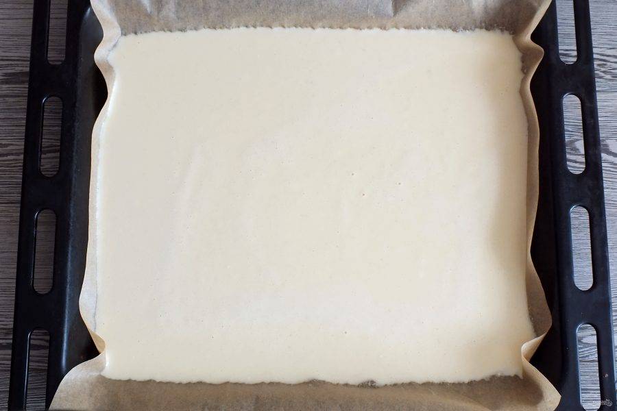 Возьмите просторный противень. Застелите бумагой для выпечки с силиконовым покрытием. Вылейте тесто. Поставьте в разогретую до 200 градусов духовку на 20-25 минут.