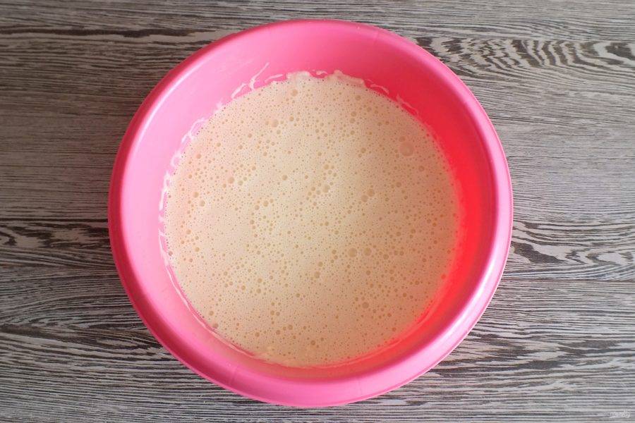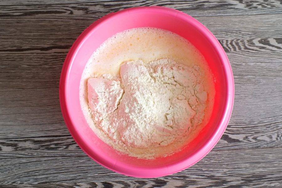 Всыпьте к яичной массе муку и молоко. Взбейте миксером до однородного состояния.