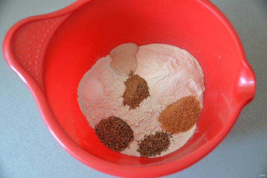 В миске для замешивания теста смешайте все сухие ингредиенты (кроме дрожжей): муку (ржаную и пшеничную), соль, тмин, кориандр, солод (или квасной концентрат), ржаную закваску, тростниковый сахар.