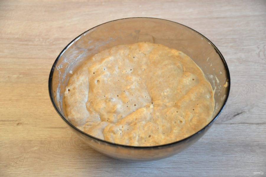 Накройте опару пищевой пленкой, поставьте для брожения в теплое место.