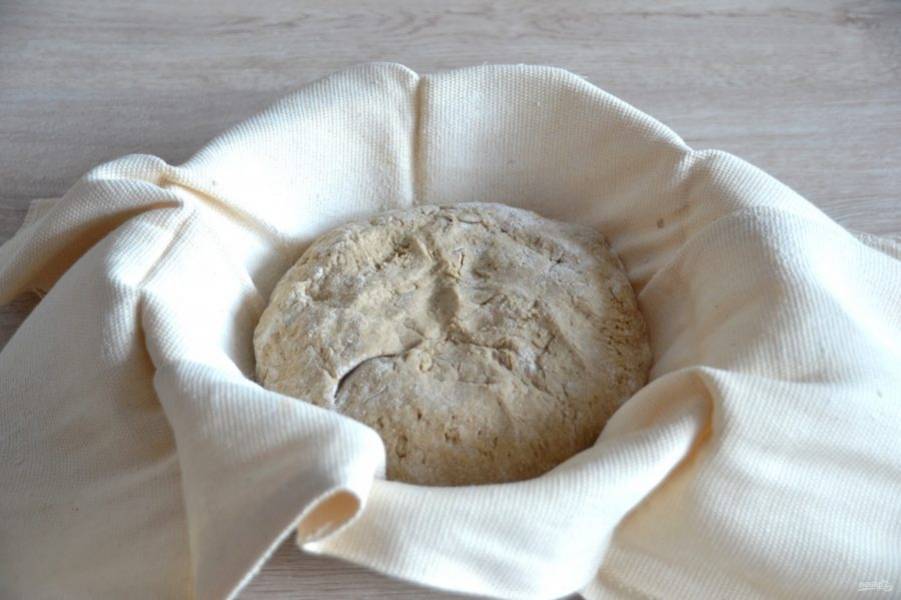 Для расстойки хлеба застелите миску салфеткой, которую следует хорошо присыпать мукой, втирая ее в ткань. Выложите хлебную заготовку "швом вверх", прикройте тесто кончиками салфетки, дайте расстойку 2 часа.