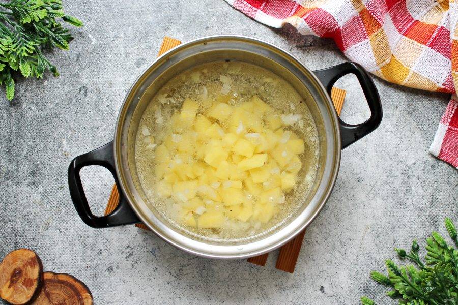 Картофель порежьте мелким кубиком и выложите в кастрюлю. Доведите все до кипения и варите в течение 5 минут.