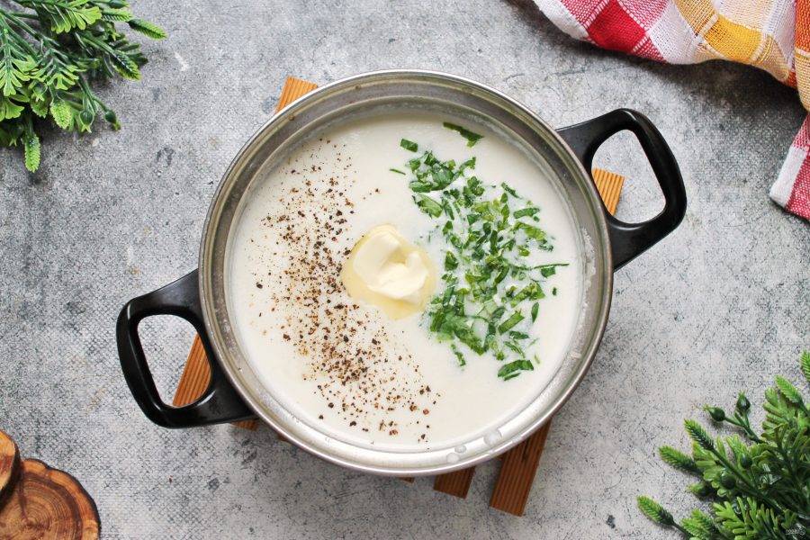 Добавьте в суп сливочное масло, перемешайте.