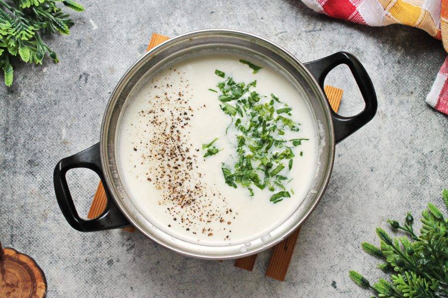 Зелень мелко порежьте и добавьте в кастрюлю. Все посолите и поперчите.