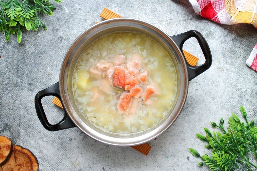 У лосося удалите кожу, выберите все кости и порежьте средним кубиком. Добавьте рыбу в суп и варите в течение 5 минут, снимая пену, если такая будет появляться на поверхности.