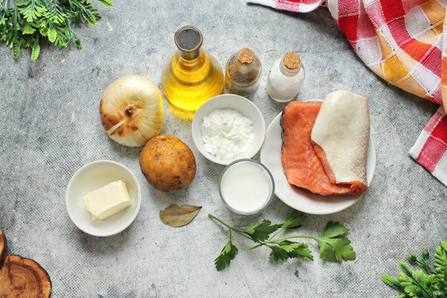 Подготовьте все необходимые ингредиенты для приготовления финского супа из лосося со сливками. Картофель и репчатый лук почистите и сполосните.