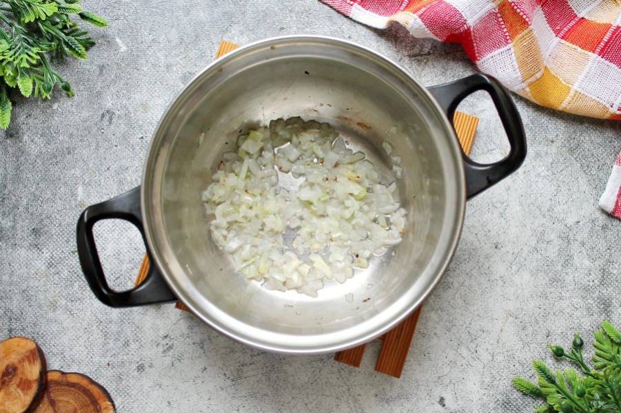 В кастрюлю с толстым дном налейте растительное масло и выложите мелко нарезанный репчатый лук. Обжаривайте лук на медленном огне, перемешивая, в течение 5-6 минут.