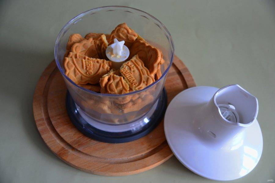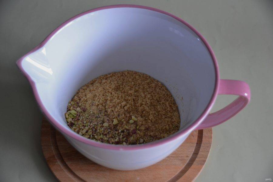 В чашу для смешивания выложите измельченную крошку печенья и часть фисташек.