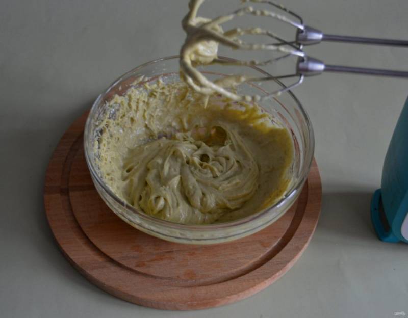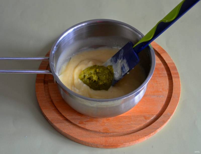 Когда крем немного остынет, введите фисташковую пасту, хорошо вмешайте ее.