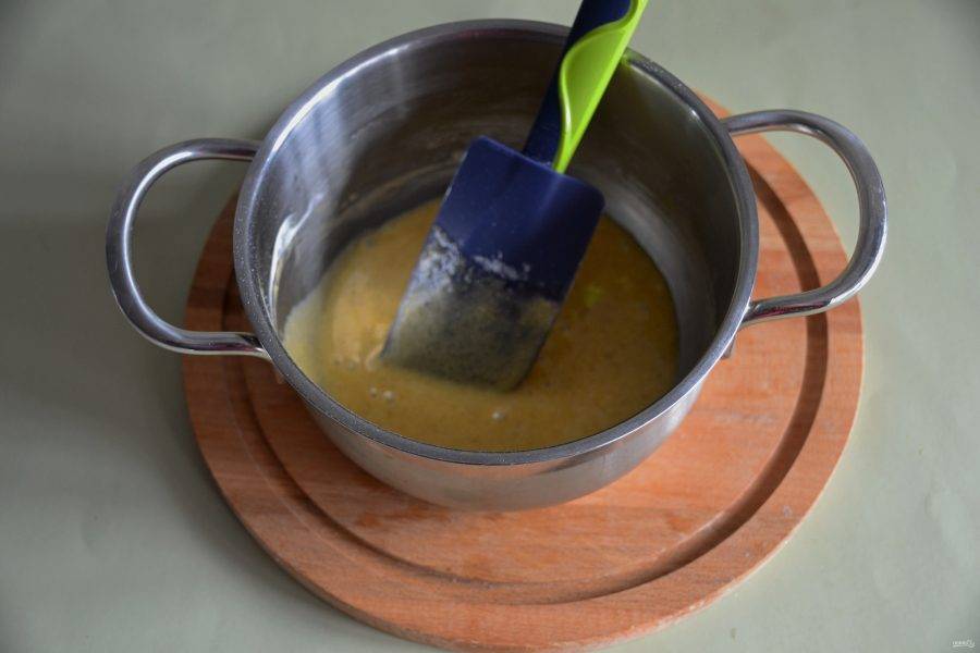 Непрерывно помешивая, доведите до загущения, как только смесь начнет загустевать, снимите с огня. Разотрите, чтобы не было комочков. Снова верните на плиту на маленький огонь и проварите помешивая примерно 30 секунд.