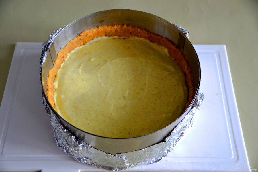 Подготовьте форму для выпечки. Если используйте кольцо для выпечки, установите его на твердую поверхность, установите диаметр 18 см., дно простелите бумагой для выпечки, снаружи оберните фольгой, лучше взять несколько слоев фольги.