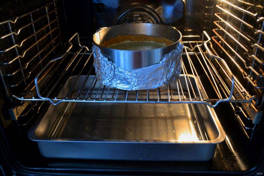 Выпекайте чизкейк при температуре 140 градусов примерно 90 минут с паром. Для этого налейте горячую воду в противень и поместите его на нижний ярус. Чизкейк поставьте на средний уровень.