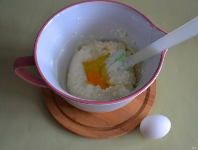 По одному введите в сырную основу 2 яйца, вмешивая по одному.