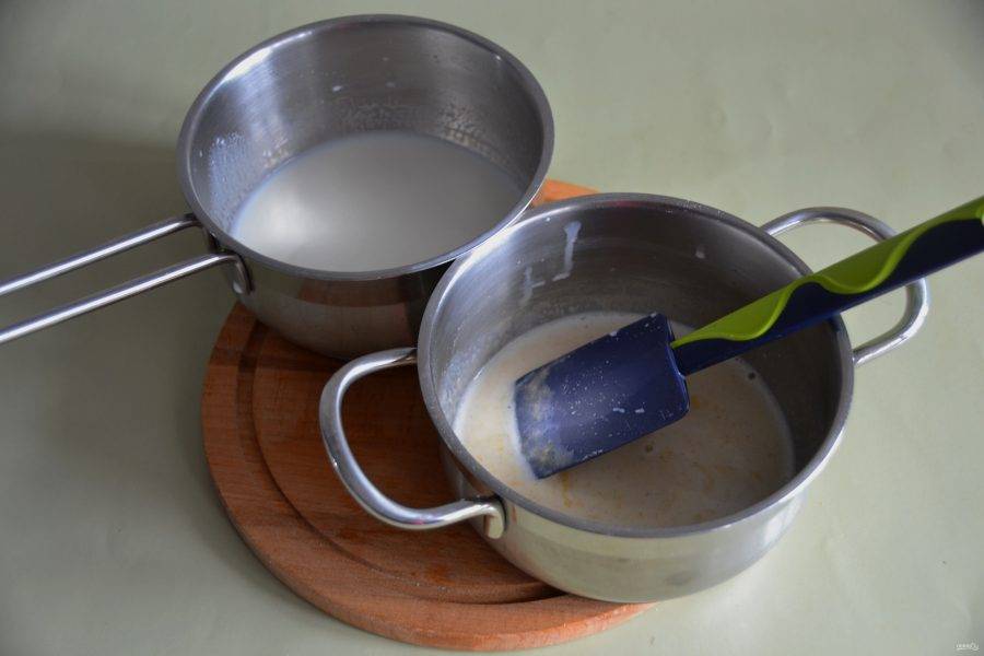 Влейте к смеси с желтком половину горячего молока, хорошо смешайте и верните обратно в сотейник. Поставьте на небольшой огонь.