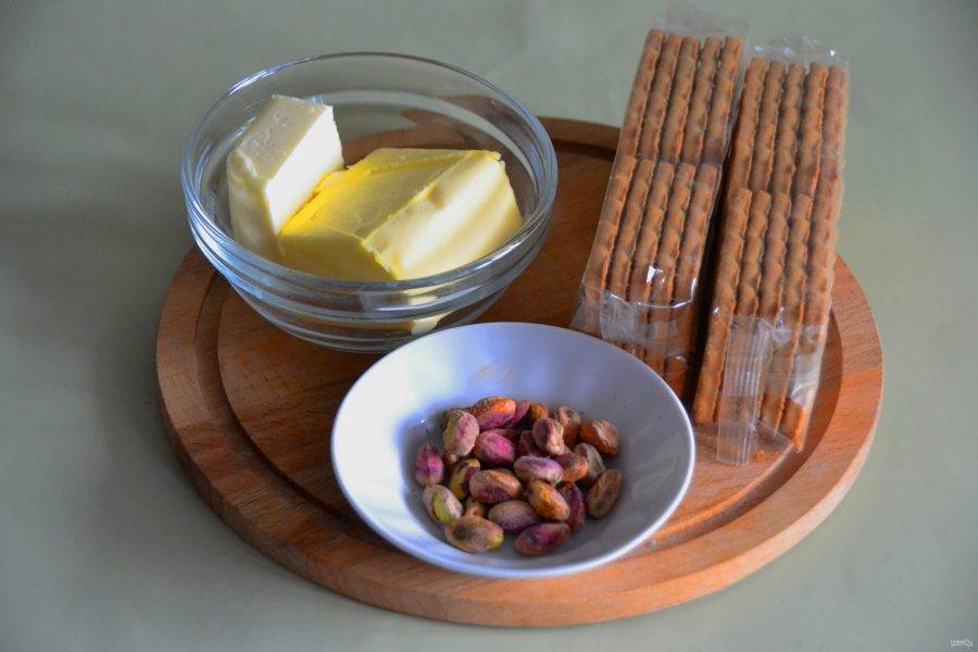 Измельчите ножом фисташки. Часть фисташек используйте для приготовления песочной основы, часть — для декора.