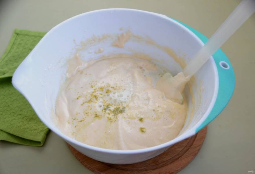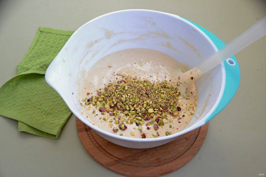 В последнюю очередь добавьте измельченные фисташки, вмешайте их в тесто.