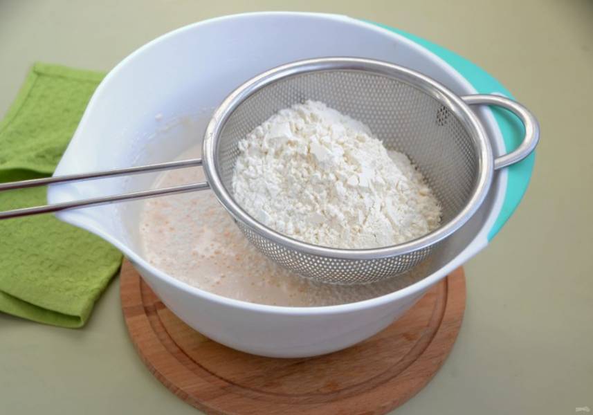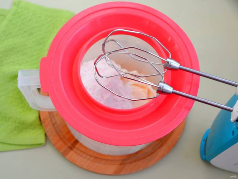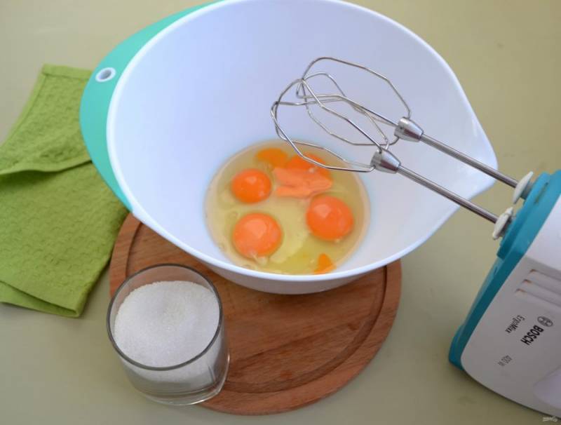 В чаше для смешивания взбейте миксером яйца и сахар, взбиваете на самой высокой скорости не менее двух минут.