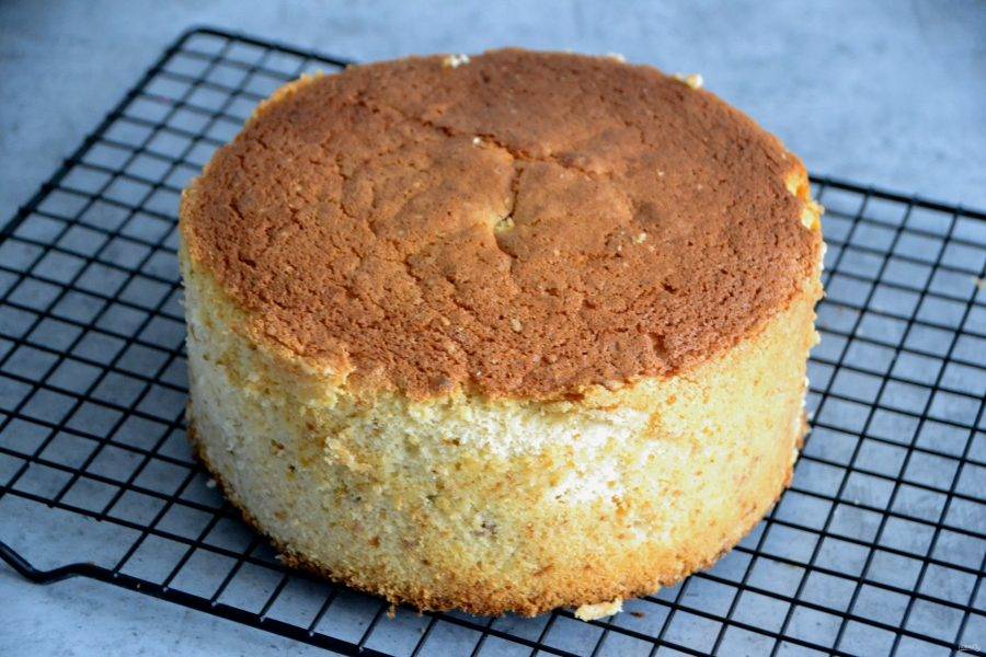 Выпекайте бисквит до готовности, готовность проверяйте деревянной шпажкой. Остудите бисквит на решетке.