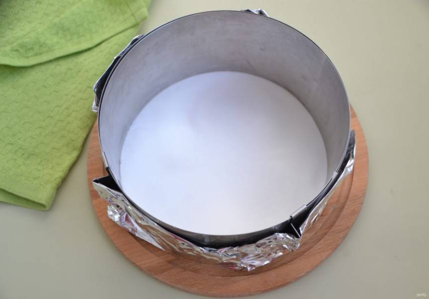 Подготовьте форму для выпекания диаметром около 18 см. Дно застелите бумагой для выпечки оберните фольгой, установите на противень и только после этого влейте тесто, поставьте в уже разогретую духовку до 170 градусов на 50-60 минут.