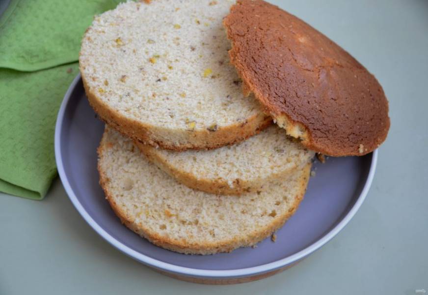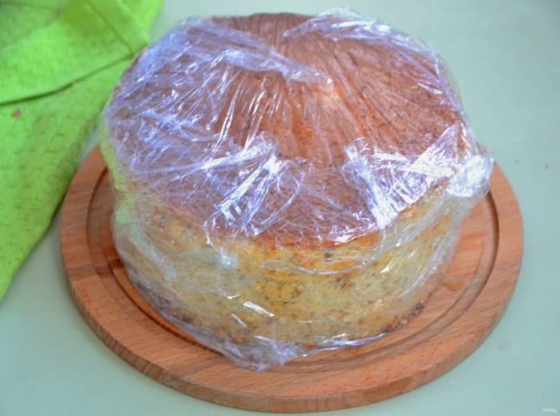 Оберните бисквит пищевой пленкой и оставьте для созревания не менее, чем на 4 часа, лучше на ночь.