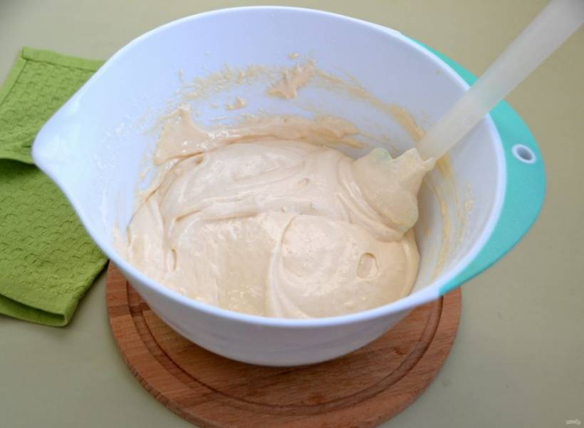 Введите жидкие ингредиенты в тесто, вымешайте лопаткой.