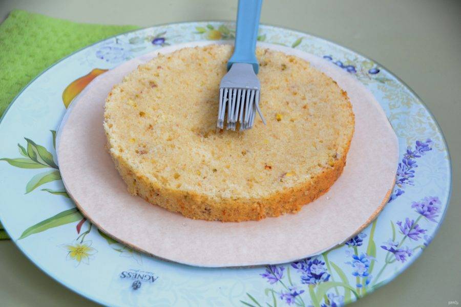 Приступайте к сборке торта. Смажьте коржи приготовленной пропиткой.