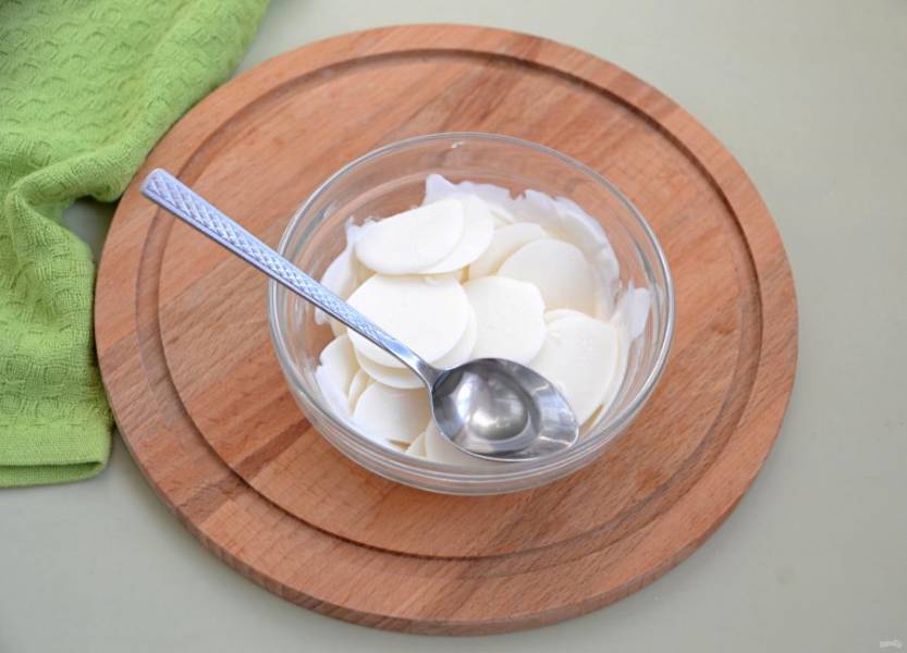 Короткими импульсами растопите в микроволновке белый шоколад с 1 ч.л. растительного масла без запаха. Температура растопленного шоколада должна быть не выше 45 градусов. Охладите шоколад до температуры 29-32 градуса в добавьте в крем.