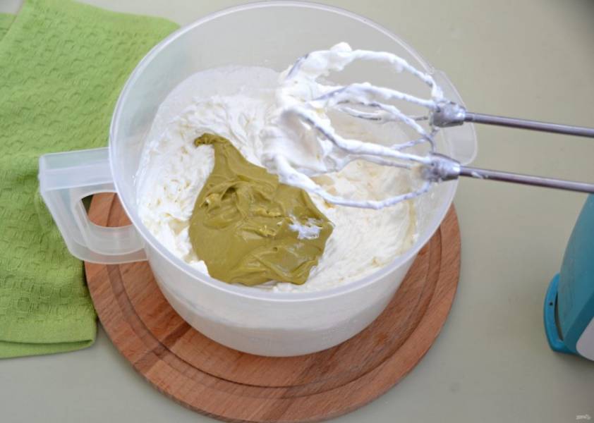 Добавьте холодные сливки и фисташковую пасту, взбейте до объединения и кремообразного состояния, крем должен загустеть а венчик должен оставлять четкие рельефные следы.