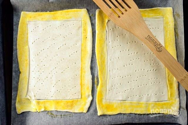 Тесто немного раскатайте. Сделайте ножом надрезы-бортики, отступая от края по 1,5 см. Смажьте бортики смесью желтка и 1 ст. л. воды. Остальное тесто наколите вилкой. Поставьте заготовки в разогретую до 180 °С духовку на 10 минут.