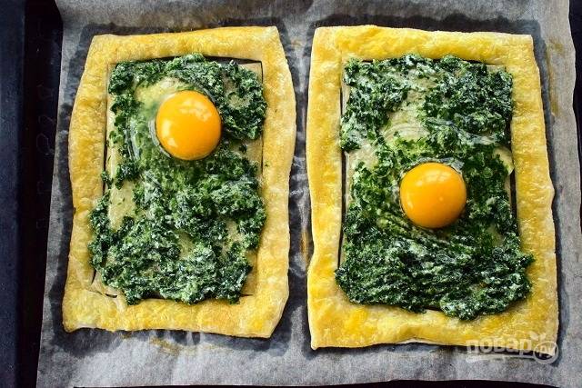 Соедините со сметаной. Разложите начинку по запеченным заготовкам, не заходя на бортики. Сверху разбейте по 1-2 яйца и отправьте будущий пирог в духовку запекаться на 7 или 12 минут. Время запекания зависит от ваших предпочтений по запеканию яйца.