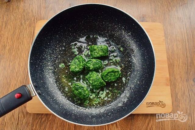 В сковороде разогрейте сливочное и оливковое масло и обжарьте шпинат в течение 2-3 минут. Добавьте мускатный орех, соль и перец по вкусу. Снимите с огня.