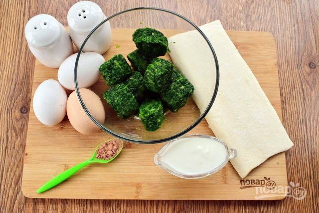 Подготовьте необходимые продукты. Шпинат и слоеное тесто разморозьте при комнатной температуре. Со шпината отожмите лишнюю жидкость.
