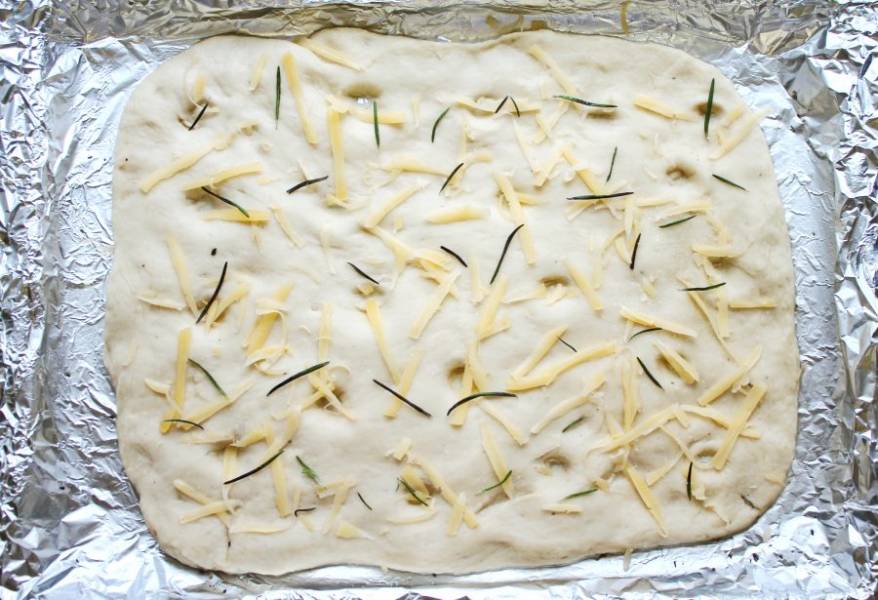 Пальцем сделайте дырочки по всей поверхности теста. Посыпьте фокачча тертым на крупной терке пармезаном и иголочками розмарина.