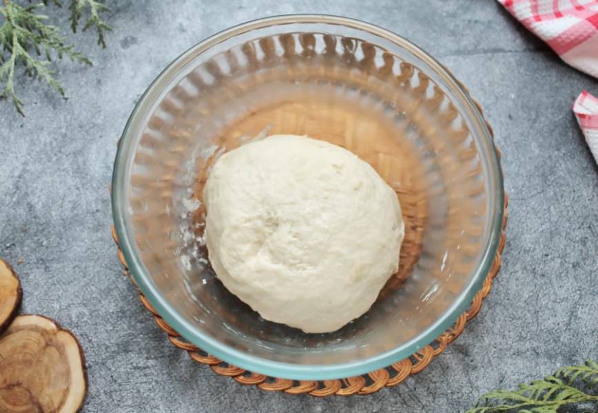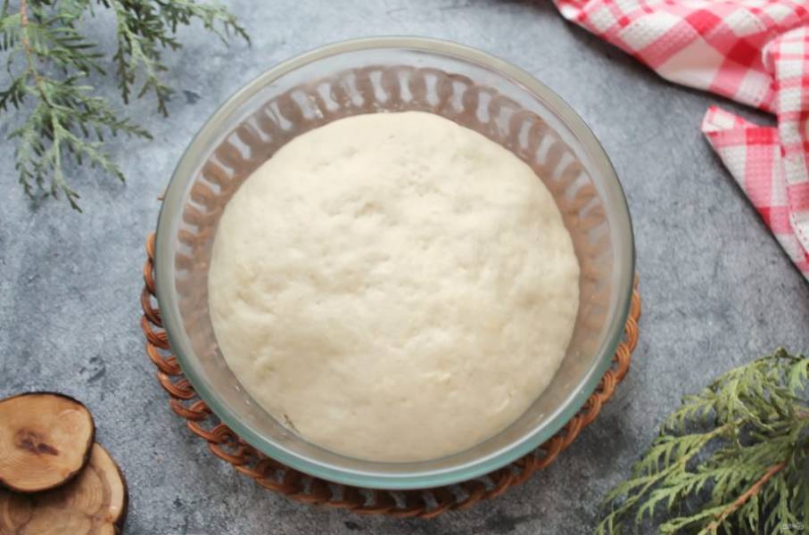 Просейте в жидкую часть муку и замесите мягкое тесто. Выложите тесто в смазанную растительным маслом миску и накройте.