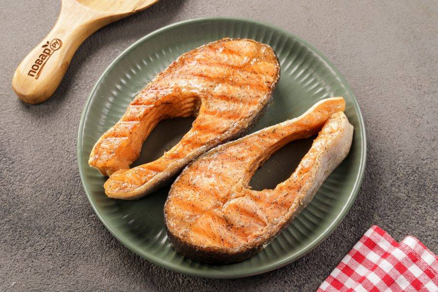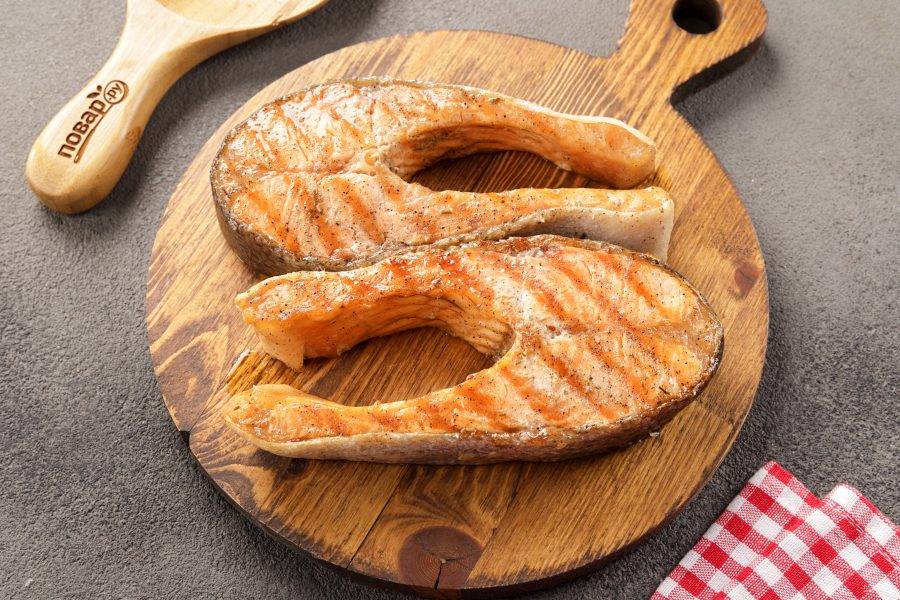 Когда стейки будут готовы, переложите их на доску и дайте полежать 5-7 минут, чтобы тепло равномерно распределилось внутри куска рыбы.