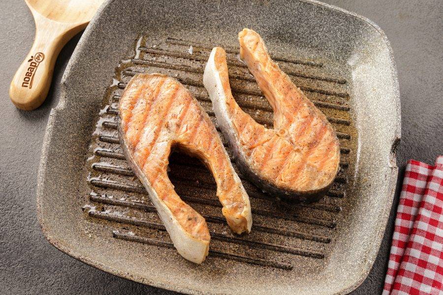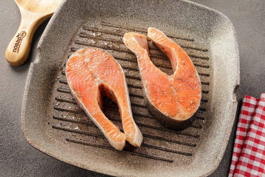 Теперь приступим к прожарке. Разогрейте сковороду и сбрызните маслом, я использую сковороду — гриль, но подойдёт и обычная с антипригарным покрытием. Выложите на сковороду подготовленные стейки. Обжаривайте на среднем огне, под крышкой 3-4 минуты. Не двигайте рыбу первые 2 минуты!