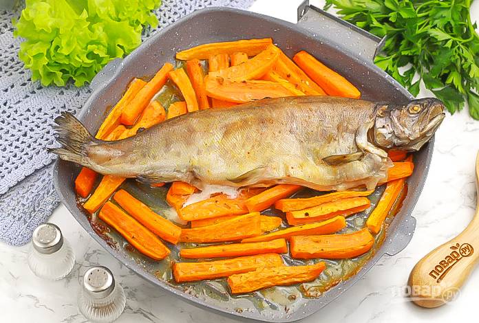 Выложите на тарелку сначала гарнир из моркови, а на него — румяную форель. Подайте к столу блюдо горячим. Приятного вам аппетита!