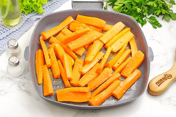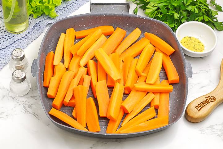 Морковки нарежьте крупными брусочками и выложите в форму для запекания.